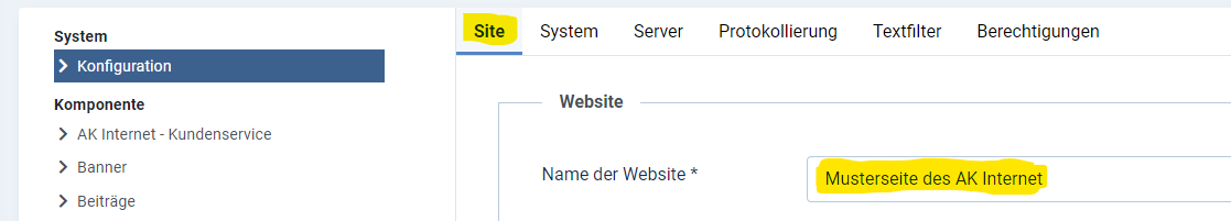 Dazu ruft ihr das Backend der Homepage auf und wählt System. Im Reiter Site könnt ihr den Weibseitenname auf eure Gemeinde anpassen. z.B. "EFG Nordmark" oder "Homepage der Friedensgemeinde"